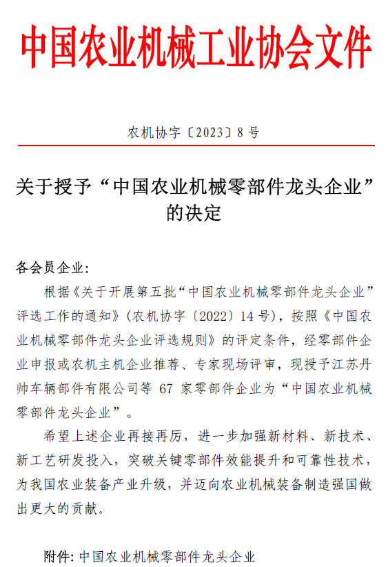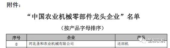 2023年3月9日,中國農(nóng)業(yè)機(jī)械工業(yè)協(xié)會發(fā)布關(guān)于授予“中國農(nóng)業(yè)機(jī)械零部件龍頭企業(yè)”的決定(農(nóng)機(jī)協(xié)字[2023]8號文件),河北圣和農(nóng)業(yè)機(jī)械有限公司位列榜單,以優(yōu)秀的配套還田機(jī)零部件而著稱。