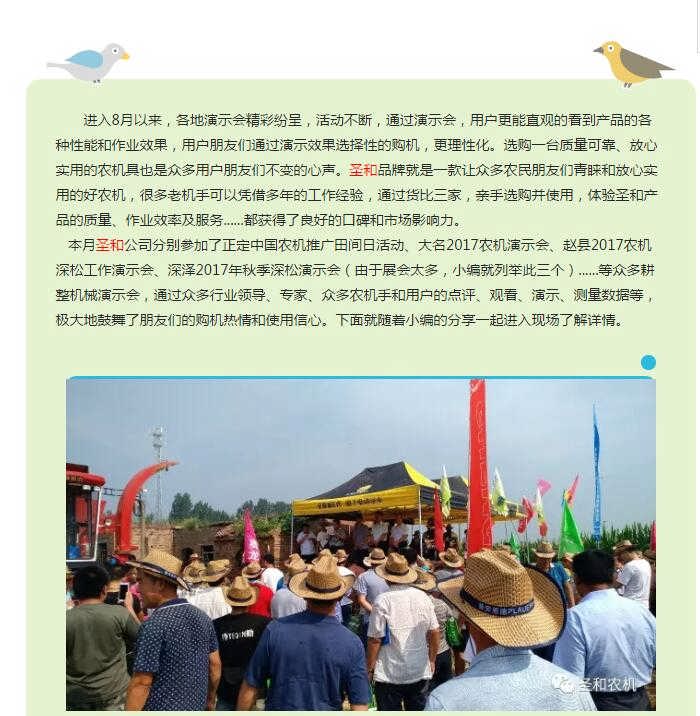 作為國家旋耕機標準起草單位、河北省著名商標、河北省優質產品、更是一家集生產、研發、流通為一體的科技型企業,深松旋耕機、雙軸滅茬旋耕機安全標志及防護裝置示范單位”、“中國旋耕機協會理事長單位”、“中國農業機械化協會會員單位”、“中國農業機械流通協會理事單位”、“河北省生產與流通協會常務理事單位”、“河北工業大學機械工程學院-產、學、研合作基地”,擁有市級研發中心,公司一直致力于保護性耕整耕種機具的研發,在中國農機具研發領域取得特別優異的成果,目前已經有近百種的農機產品在全國范圍內享受農機購置補貼,部分產品走出國際市場,遠銷海外,并受到一致好評。不斷更新,不斷完善,不斷進取......立足長遠發展于未來,圣和-您信賴的農機品牌!買農機、選圣和!