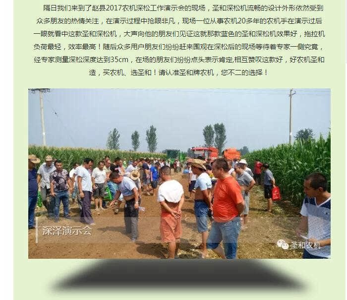 經過輾轉我們又來到了深澤2017年秋季深松演示會的現場為您帶來一線現場的深松、耕整盛況:多家玉米收獲機演示過后,觀眾為接下來的耕整機械吊足了胃口,圣和1SS-270型深松機閃亮登場,氣質不凡的“小伙兒”蓄勢待發,一口氣卯足了勁,三加五除二的快速深松過去,現場觀眾還沒來得及過足癮就完成任務!此前多位農民朋友就已經有意選購如此如意產品,都在等待這場令人矚目和期待的演示會,看到如此演示效果,笑容變得更加燦爛,紛紛表示再來一圈!經過大伙的測量深松深度達到了將近38cm左右!在隨后普勞恩德(河北)農業機械有限公司生產的普勞恩德PLAUERN旋耕機受到朋友們的高度關注,它采用德國技術,實現了旋耕機質的飛躍---采用流線型設計,零部件靜電等離子噴涂,整機流水線組裝,加工時依靠工裝、模具保證零部件的尺寸精度(側板沖壓成型、一次沖孔;刀軸焊后加工;主梁焊后加工),從而保證了整機裝配精度;上蓋板為圓弧活蓋式,使刀軸回轉上腔體空間加大,作業中甩起的泥土不易粘結,同時有利于維修保養;采用加重型刀庫,精密鑄造成型;采用日本進口刀片,持久耐用。廠內安裝刀片,交付用戶以后,不用再為刀片錯裝而煩惱。變速箱逐臺進行磨合試驗,刀軸旋轉靈活,旋耕機作業時可節省8~10馬力。刀軸采用機器人焊接,雙層迷宮槽式防塵罩,有效保護軸承不受惡劣作業環境的影響,延長了使用壽命。加寬后托板,確保達到最佳平地效果。防磨板采用加寬、加大結構,可根據地域要求選擇配裝。側板兩側可選裝切草刀,斬斷、分離工作中堆積的草團。整機覆膜、木箱包裝,既保護了整機外觀的亮麗如新,又節省了運輸、儲存空間。真是買不知道,不用不知道,此次演示會獲得了眾多農機合作社和老機手的充分肯定,圣和農機以真實的用戶體驗,完美的演示效果讓在場的每個人都心悅誠服。